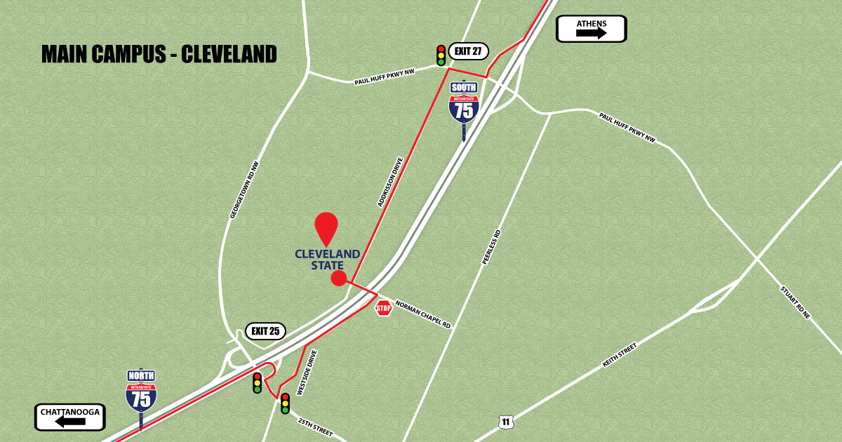 The college is located between Exits 25 and 27 on I-75, 30 miles northeast of Chattanooga.